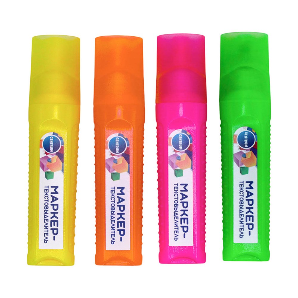 Маркеры-текстовыделители Centrum "НЕОН". Универсальные текстовыделители в ярких неоновых оттенках для быстрого и точного оформления печатных и рукописных текстов. Пластиковый корпус выполнен в цвет чернил, дополнен плотно прилегающей крышкой. Чернила не имеют резкого химического запаха, мгновенно высыхают, не отпечатываясь на обратной стороне. Устойчивы к выцветанию, выделенная область не теряет первоначальной яркости со временем. Скошенный наконечник позволяет проводить линии 1-5 мм.
