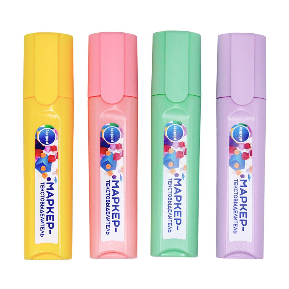 Маркеры-текстовыделители Centrum "ПАСТЕЛЬ". Универсальные текстовыделители в приглушенных пастельных оттенках для быстрого и точного оформления печатных и рукописных текстов. Пластиковый корпус выполнен в цвет чернил, дополнен плотно прилегающей крышкой. Чернила не имеют резкого химического запаха, мгновенно высыхают, не отпечатываясь на обратной стороне. Устойчивы к выцветанию, выделенная область не теряет первоначальной яркости со временем. Скошенный наконечник позволяет проводить линии 1-5 мм.