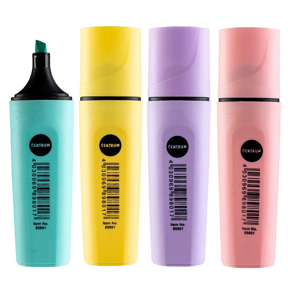 Набор текстовых-маркеров Centrum "PASTEL" предназначен для маркировки рукописного и печатного текста. Маркер представлен в пластиковом цветном корпусе. Цвет корпуса соответсвует цвету чернил. Чернила не имеют резкого химического запаха, мгновенно высыхают, не отпечатываясь на обраной стороне. Устойчивы к выцветанию, выделенная область не теряет первоночальной яркости со временем. Скошенный наконечник позволяет проводить линии 1-5 мм. В наборе 4 пастельных цвета - желтый,розовый, голубой, фиолетовый.