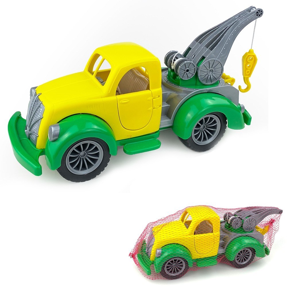 Машинка оснащена подвижным краном с крюком и кольцом на переднем бампере, куда можно продеть верёвочку, чтобы катать машинку за собой.