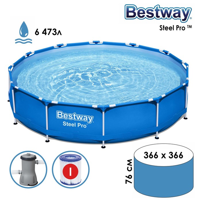 Бассейн каркасный Steel Pro, 366 см × 76 см, с фильтр-насосом, 56681, уценка