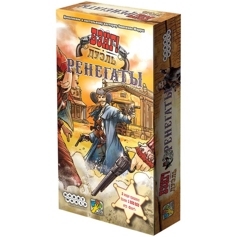 Дополнение к игре "Бэнг! Дуэль" добавляет третью группу стрелков – ренегатов. Четыре новых режима игры позволяют им сражаться на стороне закона или бандитов, а также выступать как самостоятельный отряд, преследуя личные цели. Охладить пыл головорезов поможет оружие на новых картах ресурсов.