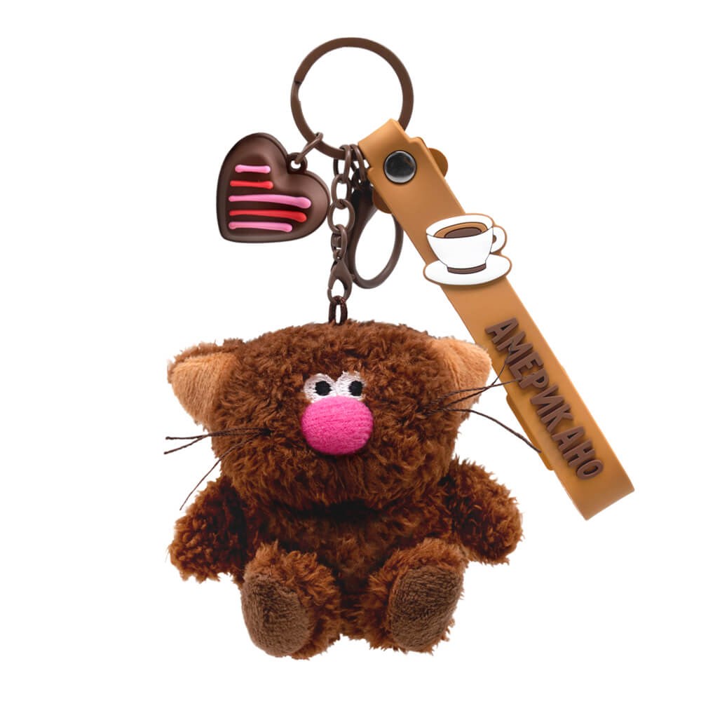 )Кот брелок Американо. Брелок сшит из тактильно приятного эко меха коричневого цвета. Усики из шелковистого кручёного шнура. Объемный носик обтянут розовым софтом. Глазки вышиты. На пяточках вшит темно‑коричневый софт, а внутри ушек карамельный софт. Брелок крепится на кольцо шоколадного цвета с силиконовыми подвесами. Один подвес – это браслет с хештегом «вместоЗАРЯДКИ» на кнопке и с фирменным логотипом «Кофейные коты». Другой подвес – шоколадка в виде сердечка с розовыми кремовыми полосками.