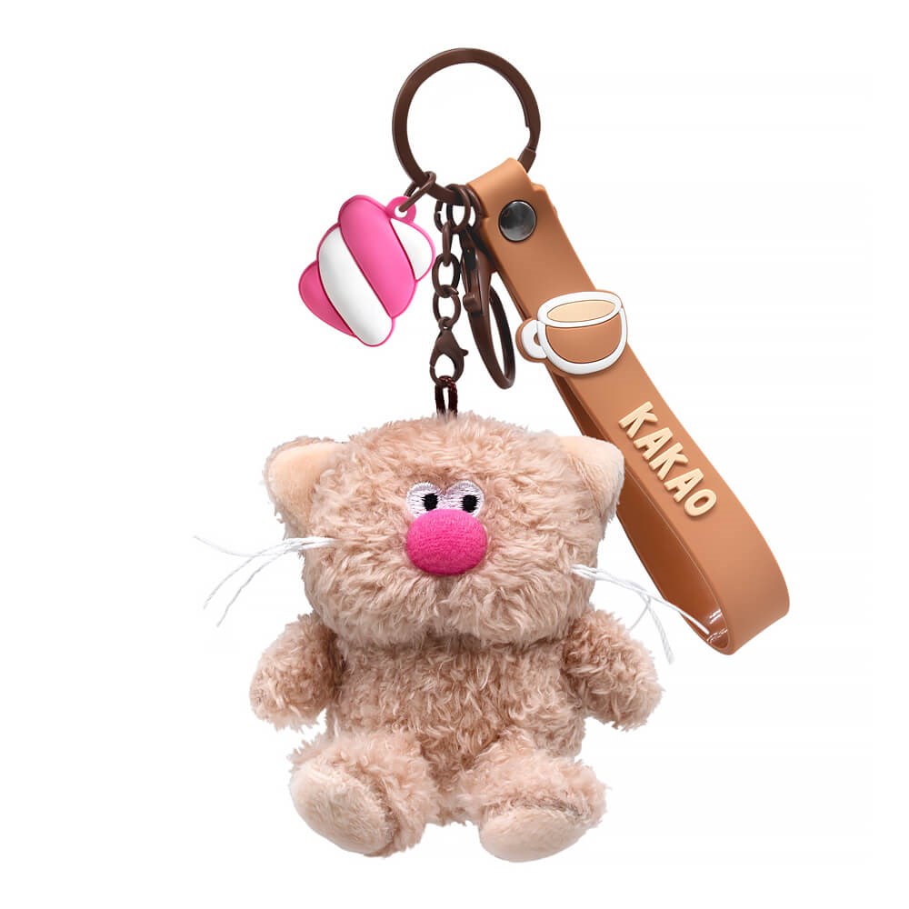 )Кот брелок Какао. Брелок сшит из тактильно приятного эко меха цвета какао. Усики из шелковистого кручёного шнура. Объемный носик обтянут розовым софтом. Глазки вышиты. На пяточках и внутри ушек вшит молочный софт. Брелок крепится на кольцо шоколадного цвета с силиконовыми подвесами. Один подвес – это браслет с хештегом «специальноДЛЯтебя» на кнопке и с фирменным логотипом «Кофейные коты». Другой подвес – бело‑розовая карамель‑тянучка.