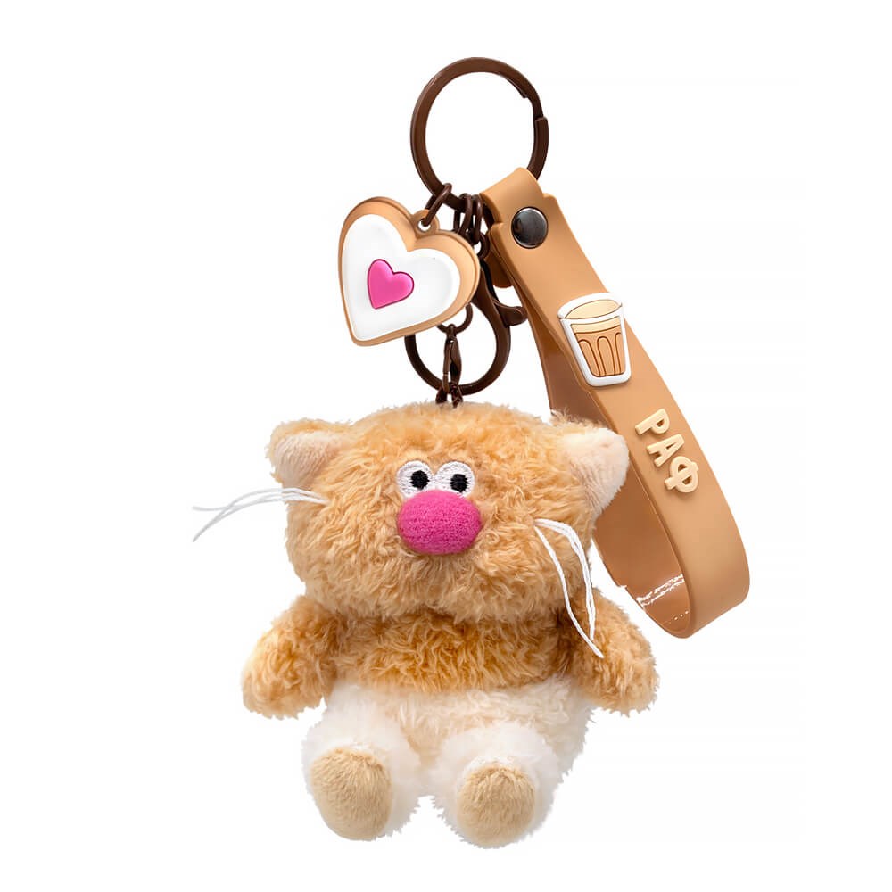 )Кот брелок Раф. Брелок сшит из тактильно приятного эко меха в двух оттенках: цвета песочного печенья и цвета топленого молока. Усики из шелковистого кручёного шнура. Объемный носик обтянут розовым софтом. Глазки вышиты. Пяточки из софта цвета крема, а внутри ушек софт сливочного цвета. Брелок крепится на кольцо шоколадного цвета с силиконовыми подвесами. Один подвес – это браслет с хештегом «МЕЧТАЙмасштабно» на кнопке и с фирменным логотипом «Кофейные коты». Другой подвес – печенье в виде сердечка с белым кремом сверху и розовым сердечком в середине.