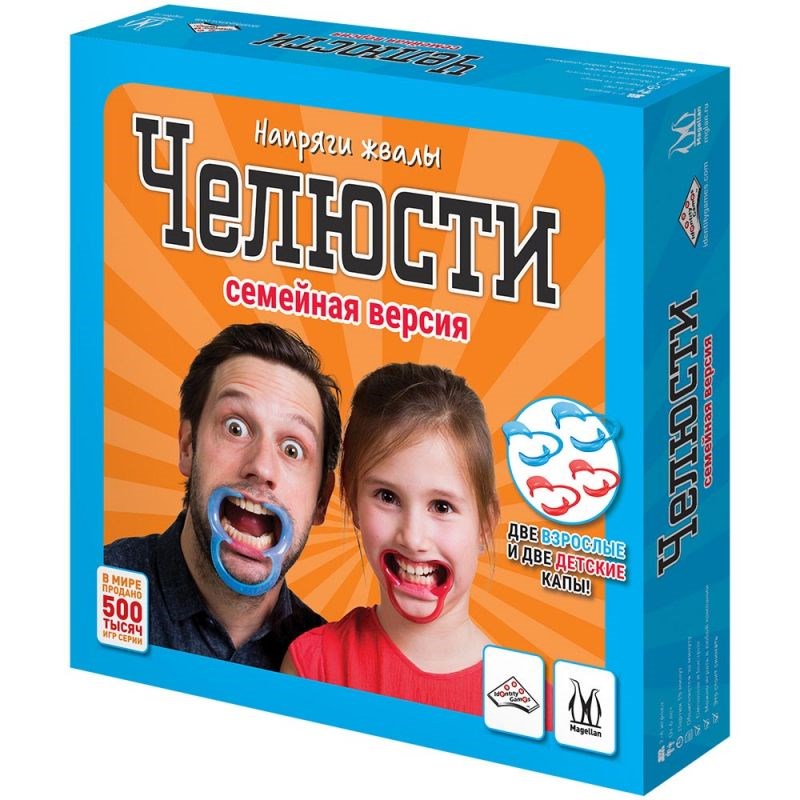 Челюсти возвращаются по-семейному со специальными капами для детей. В свой ход вы берёте карту с заданием. Оно может быть на объяснение слов или на выполнение действия. В этом вам мешает пластиковая капа во рту. За каждое выполненное задание вы получаете очки. Побеждает тот, кто набрал больше всех.