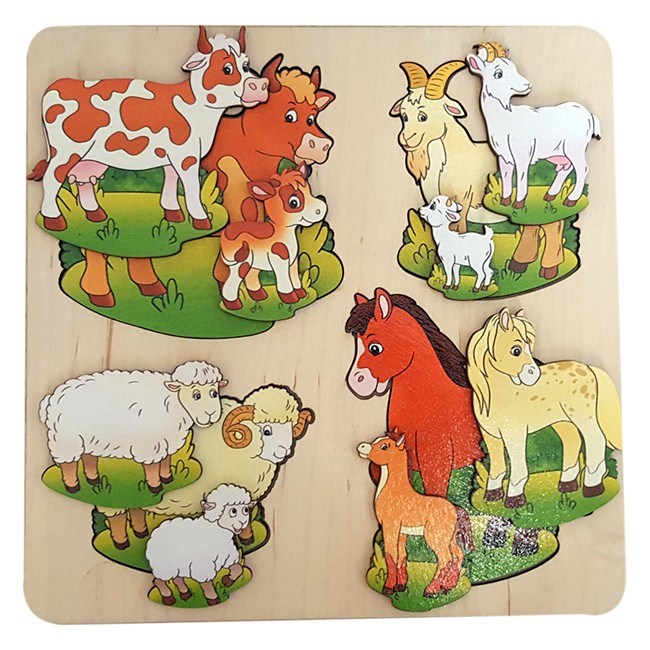 Развивающая доска "Домашние животные" - это полезная и увлекательная игрушка для малышей, которая поможет ребенку получить множество новых знаний. В комплект входит рамка с отверстиями, а также 12 вкладных элементов в виде четырех разных семейств, обитателей фермы - коров, коз, барашков и лошадей. Каждая семейка состоит из мамы, папы и детеныша - рассматривая фигурки, ребенок познакомится с понятием "большой-средний-маленький", узнает название и внешний вид животных, потренирует навыки логики, зрительного восприятия, мелкой моторики и сообразительность. Все элементы изделия выполнены из экологически чистого материала - дерева, хорошо отшлифованы и окрашены безопасными нетоксичными красками.