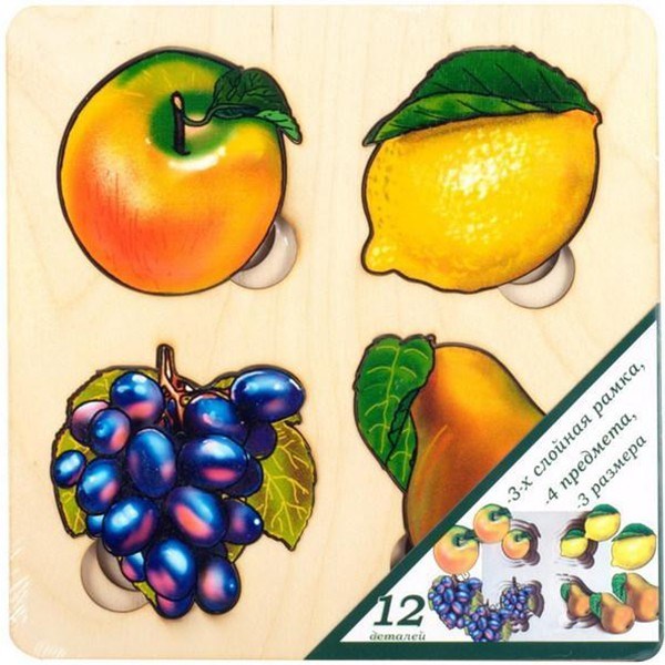 В наборе 12 вкладышей четырех видов. Для каждого фрукта есть 3 вкладыша разного размера. Маленькие вкладыши прячутся под большими. Для того, чтобы вкладыши было удобнее вынимать из основы, сделаны специальные выемки.