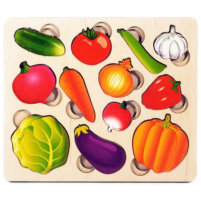 Развивающая доска "Овощи" - это полезная и увлекательная игра для малышей. Ее особенностью является то, что вкладные элементы - двойные, одна часть представляет собой целый овощ, а вторая - его отрезанную часть. Рассматривая вкладыши. ребенок будет изучать название овощей, узнает об их пользе для организма, а еще познакомится с таким важным понятием, как "часть-целое", увидит, как устроены разные овощи внутри. Такая игра поможет малышу развить мелкую моторику, получить новые знания об окружающем мире, потренировать логическое мышление и сообразительность. Все элементы изделия выполнены из экологически чистого материала - дерева, хорошо отшлифованы и окрашены безопасными нетоксичными красками.