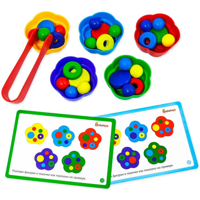 Развитие навыков чтения, письма, логики, внимания, находчиваости, талантов, разума, мышления. С помощью этого сортера малыш развивает память, внимание, мелкую моторику. В аккуратной цветной коробке содержатся карточки-задания, деревянная подставка с цветными лунками и деревянные шарики с пинцетом. Ребёнок сможет выполнять задания из карточек как самостоятельно, так и вместе с родителем. Сортер позволяет тренировать мелкую моторику с помощью специального пинцета. А если учить ребёнка пользоваться этим инструментом обеими руками, то можно развить навыки к амбидекстрии.