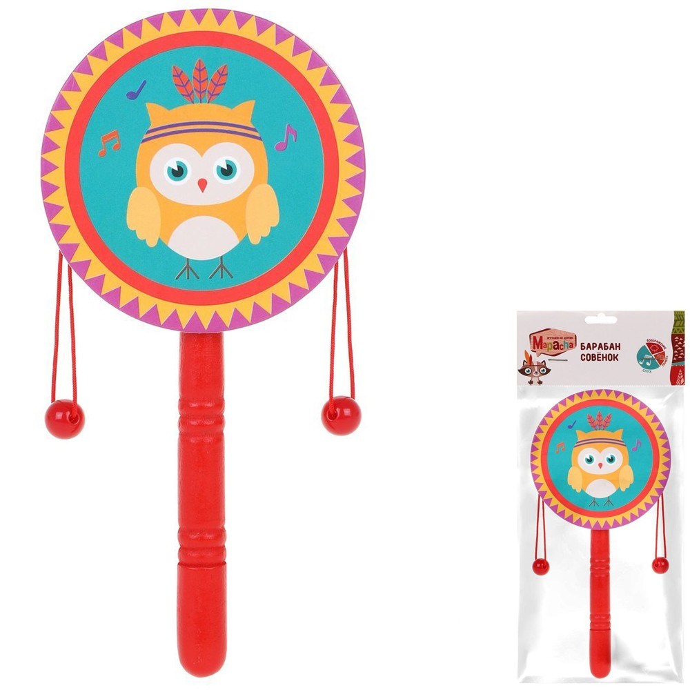 Барабан на палочке «Совенок» привлечет внимания малышей. С помощью нее ребенок будет выстукивать различные мелодии, под которые можно петь или танцевать.