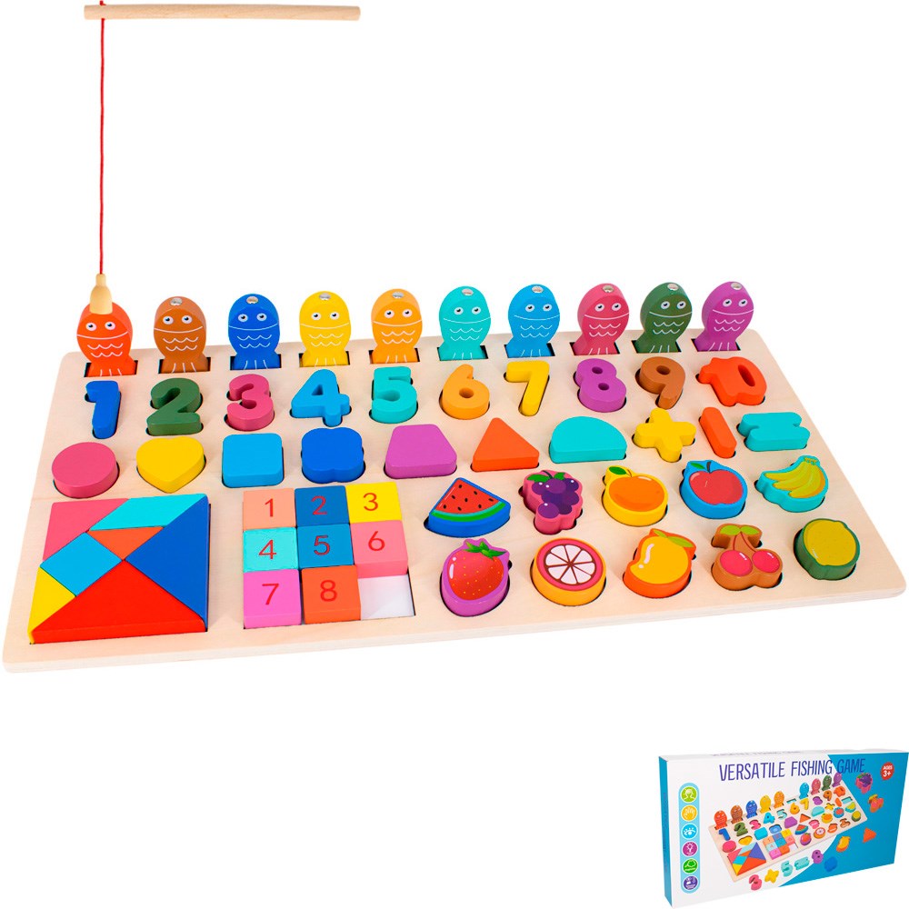 - в комплекте деревянная палочка с магнитом, при помощи которой можно разыграть игру в рыбалку;