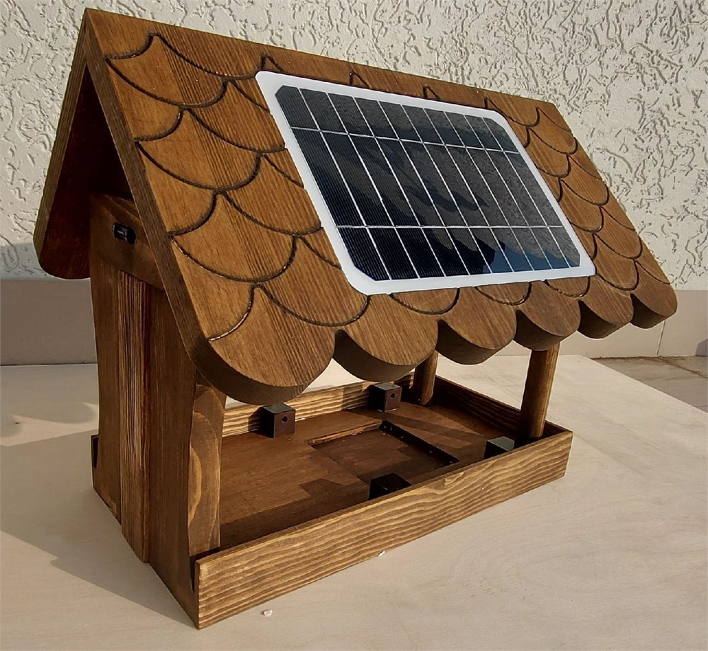 Деревянная кормушка для птиц с функцией автоматического фотографирования, встроенным аккумулятором и системой солнечной батареи для максимально долго автономной работы.