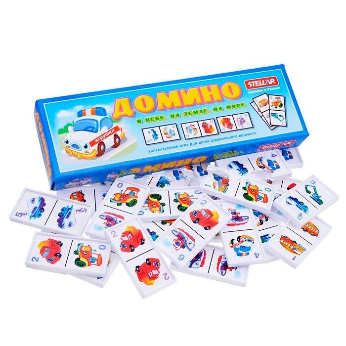 Домино «В небе, на земле, на море» непременно будет интересно малышу. Принцип игры тот же, что и во взрослой игре, только вместо точек на костяшках нарисованы яркие картинки с различными видами транспорта - наземного, воздушного и специального. Складывая костяшки одинаковыми изображениями друг к другу, ребенок будет тренировать зрительную память, ориентацию на плоскости, внимание и мелкую моторику, а также расширит свой кругозор и познакомится с различными видами техники.
