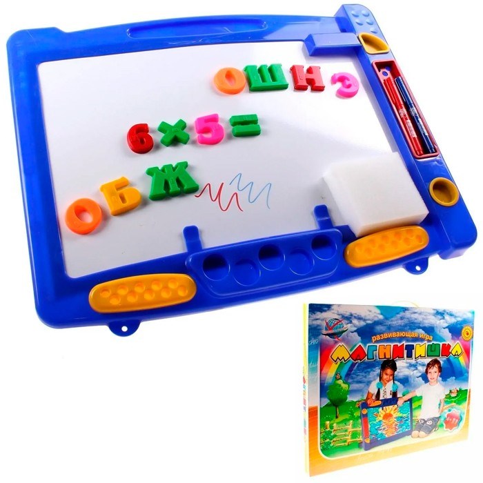 Доска «Магнитишка» (c маркерами). Доска металлическая с полимерным белым покрытием в пластмассовой рамке 40х58 см. В комплект входят маркеры 2х цветов ,которыми можно рисовать на доске, губка для удаления рисунка, счеты-часы на магните. Для детей от 3 до 10 лет.