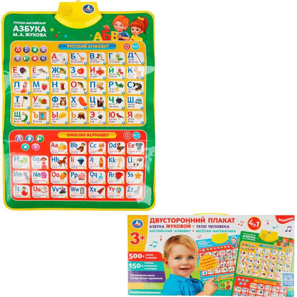 Обучающий двусторонний плакат 4 в 1 «М.А. Жукова. Азбука», «Тело человека», «Английский алфавит» и «Весёлая математика» ТМ «Умка» - многофункциональный помощник малышу в познании окружающего мира.