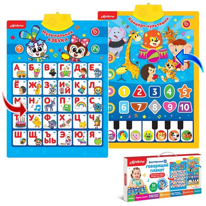 • Плакат позволит буквы, цифры, формы и цвета, познакомиться с животными и музыкальными инструментами.