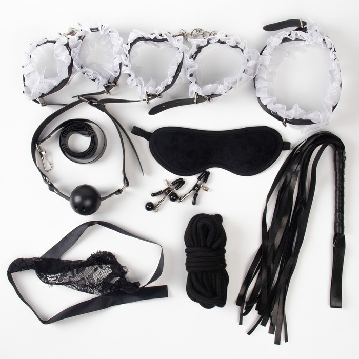 Эротический БДСМ набор с белым кружевом, чёрный, экокожа, 9 предметов