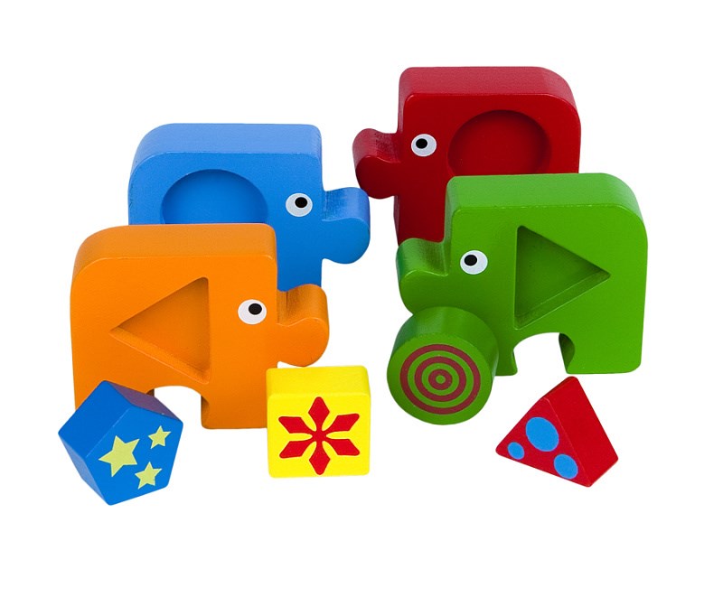 Игра состоит из 4 цветных элементов пазла, на лицевой и обратной сторонах которых есть 2 углубления различной формы.