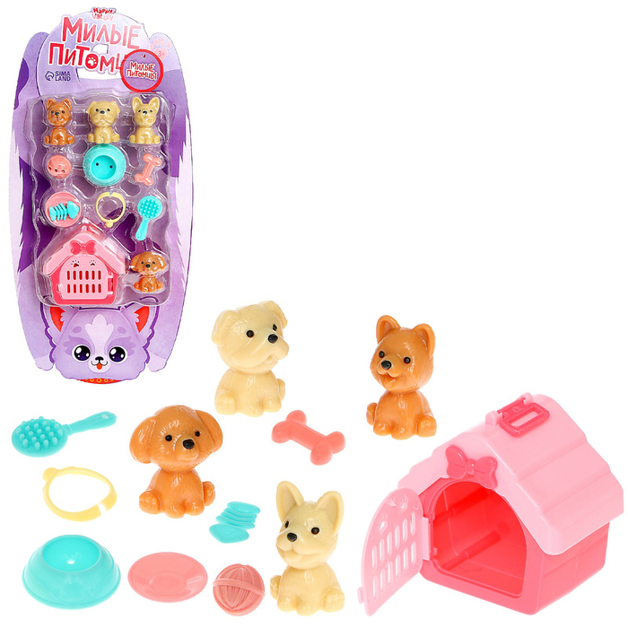 - Аксессуары для животных: будка-домик, миска, тарелка, мячик, кость, рыбка, расчёска, ошейник.