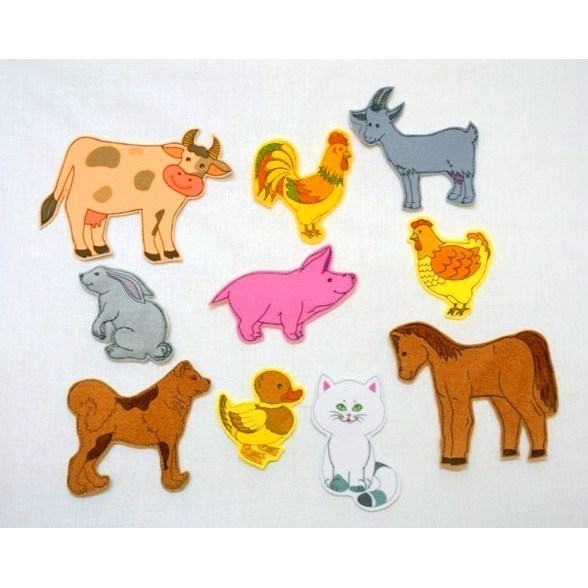 В наборе – основные домашние животные. Это - корова, петух и курица, коза, заяц, свинья, собака, утка, кошка, лошадь. Каждое животное снабжено липучкой (лентой Velcro). Данный набор подходит для работы с игровым полем.