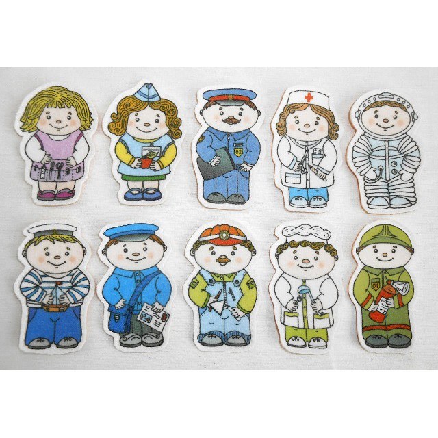 Набор содержит фигурки, изображающие людей следующих профессий - парикмахер, продавец, полицейский, врач, космонавт, моряк, почтальон, строитель, повар, пожарный. Каждая фигура снабжена липучкой (лентой Velcro). Данный набор подходит для работы с игровым полем.