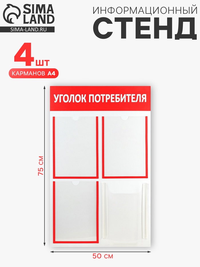 Информационный стенд «Уголок потребителя» 4 кармана (3 плоских А4, 1 объёмный А4), цвет красный
