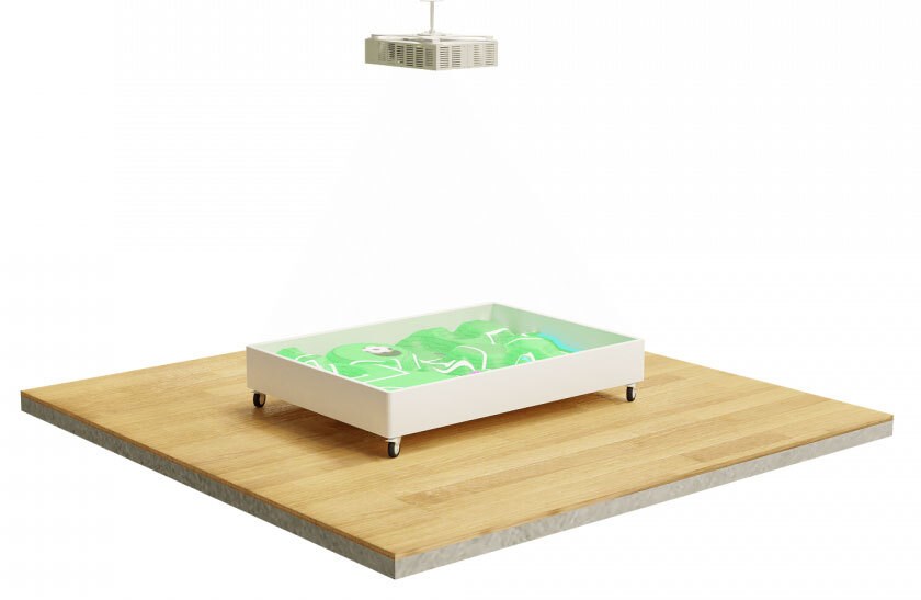 Комплект включает в себя проектор, 3D датчик объема с ПК, резервуар для песка из ЛДСП на колесах, песок.