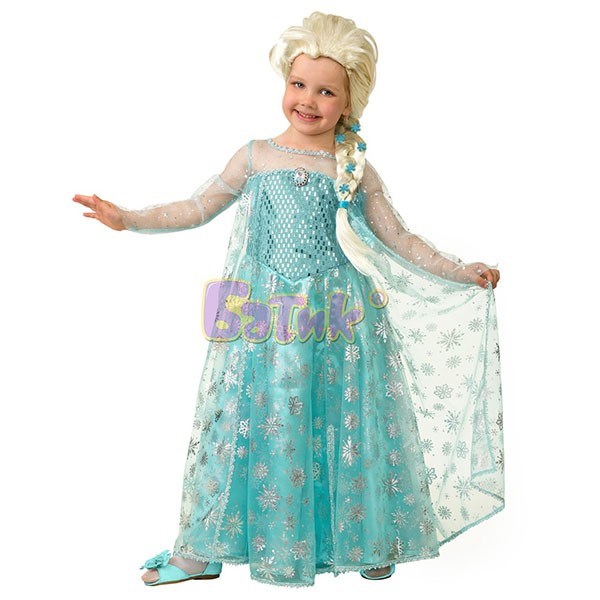 Если малышка любит мультфильм "Холодное сердце" и в восторге от его героини Эльзы, то такой карнавальный костюм точно придется ей по душе. В нем девочка сможет отправиться на утренник, выступить в костюмированном шоу или даже стать звездой фотосессии. Для создания сказочного образа в комплект входят: длинное платье с полупрозрачными длинными рукавами, парик в виде белой косички со снежинками, а также брошка с изображением Эльзы. Корсет платья выполнен из блестящей ткани, верхняя юбка украшена блестящими снежинками, накидка пришита к груди.