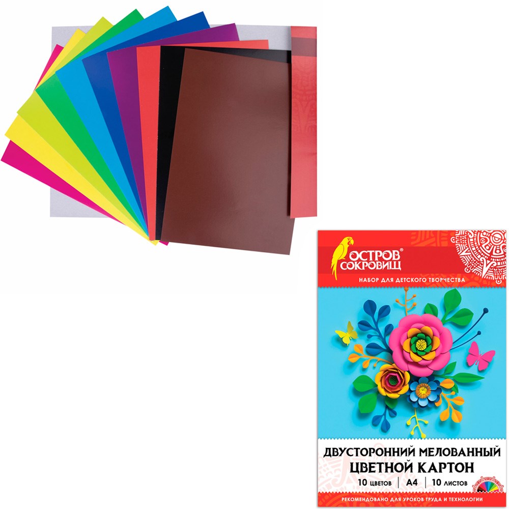 Картон цвет. 10 л. 10 цв. А4 мелованный 2-сторонний Остров сокровищ Юнландия 111319