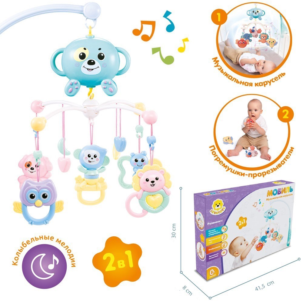 Комплектация: музыкальная карусель, 5 съёмных игрушек-прорезывателей