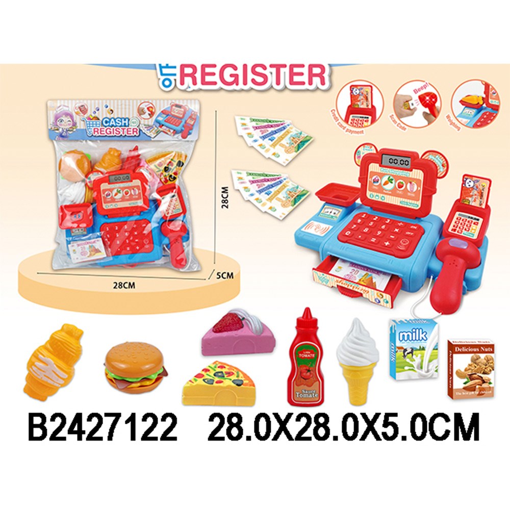 - в комплект входит касса со сканером, деньги, кредитная карта, игровые атрибуты;
