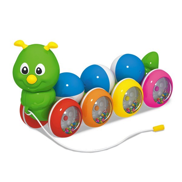 Увлекательная каталка «Гусеница с шариками» обязательно понравится вашему малышу! На спинке гусенички расположены 3 бело-голубых шарика. При движении гусенички шарики перекатываются, но не падают. Они легко снимаются и при желании легко возвращаются на свои места. В лапках у гусенички колечко, к которому прикреплена веревочка. Держа веревочку, малыш сможет катать гусеничку. Яркие колеса наполнены маленькими разноцветными шариками, которые при движении пересыпаются и издают приятно-бодрящий звук.