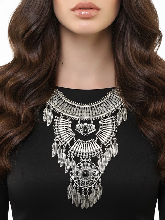 - Эталон стиля: колье располагает несколькими элементами, создающими вертикальную линию, проходящую через область ключиц и шеи, акцентирующую внимание на зоне декольте.