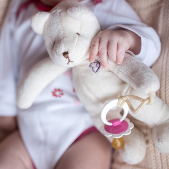 Комфортер - игрушка малыша, которая первой попадает ему в маленькие ручки. Во время кормления приложите комфортер к маме, и тогда ребенок почувствует себя спокойнее и быстрее засыпать, если игрушка пахнет мамой. Закрепите пустышку на лапке Мишки, благодаря чему малыш научится находить пустышку сам.