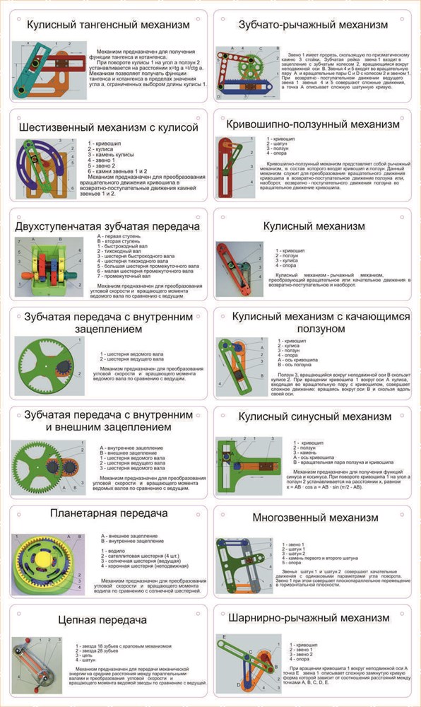 Комплект состоит из отдельных действующих моделей механизмов, каждый из которых установлен на индивидуальной подставке и снабжен информационной табличкой, на которой представлено название механизма, его краткое описание