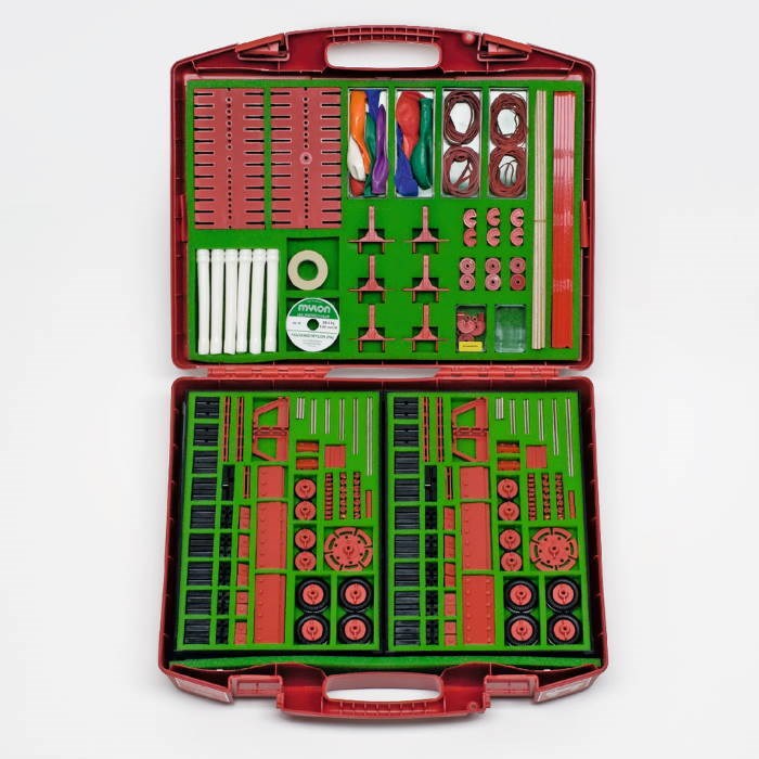 В комплект лабораторного оборудования входят 6 технических конструкторов, состоящих из готовых элементов конструкций. В крышке чемодана находятся основания для сборки моделей и вспомогательные элементы для различных движителей и приводов.