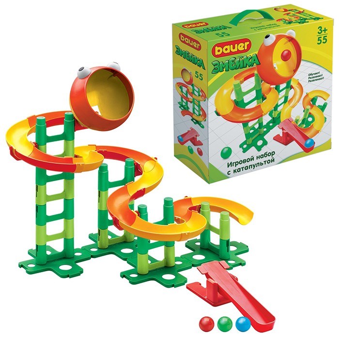 Количество элементов: 55 (желоба различных конфигураций, крепления для желобов, подставки, основания для креплений, кубики, катапульта, сборная голова Змейки)