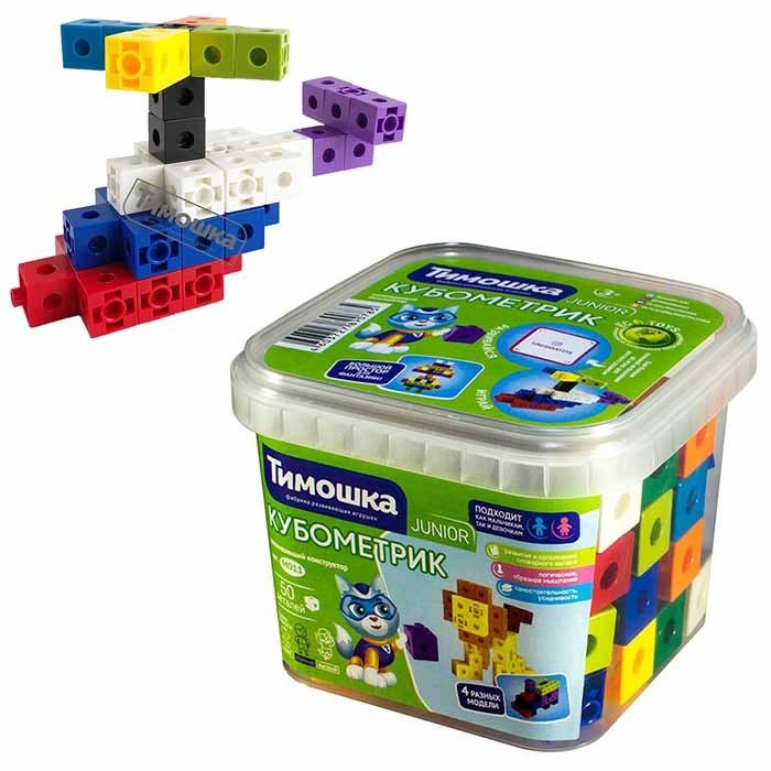 Конструктор "Кубометрик" - это простор для детского творчества и фантазии. В комплекте - 50 разноцветных деталей, выполненных в виде кубиков с выступами и углублениями. Из таких элементов можно создавать невероятное количество конструкций, в виде домов, транспорта, животных и фантастических существ. Собирая детали "Кубометрика", дети смогут потренировать навыки мелкой моторики, пространственного и логического мышления, цветовое восприятие и фантазию.
