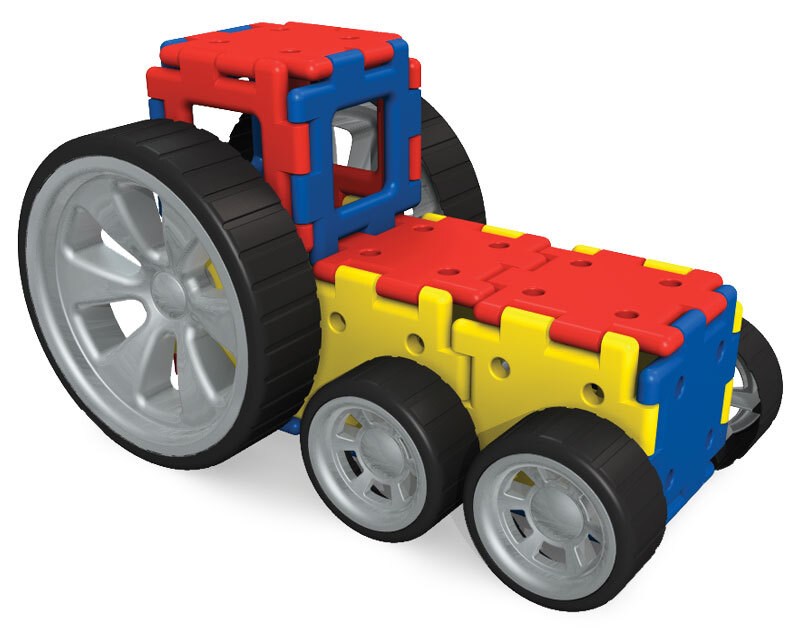 Собранный из квадратов и колес своими руками автомобиль приводит ребенка в восторг и наполняет его гордостью за собранную большую машину, на которой он может посидеть и даже прокатиться. С помощью колес двух разных размеров можно построить огромное количество великолепных устройств.