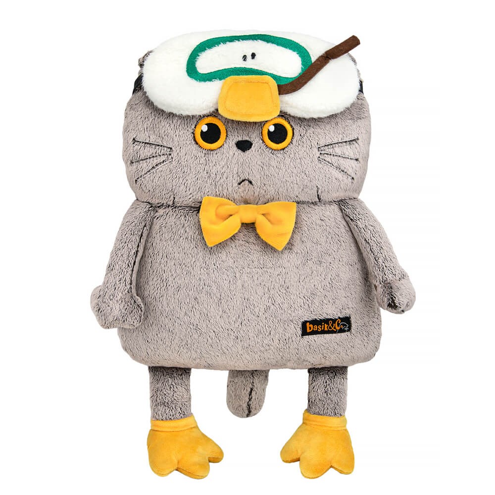 )Кот Басик подушка с забавной маской для сна в виде Гусика в плавательной маске и с трубкой. Также на Басике милые тапки в виде лапок гуся из софта охристого цвета.