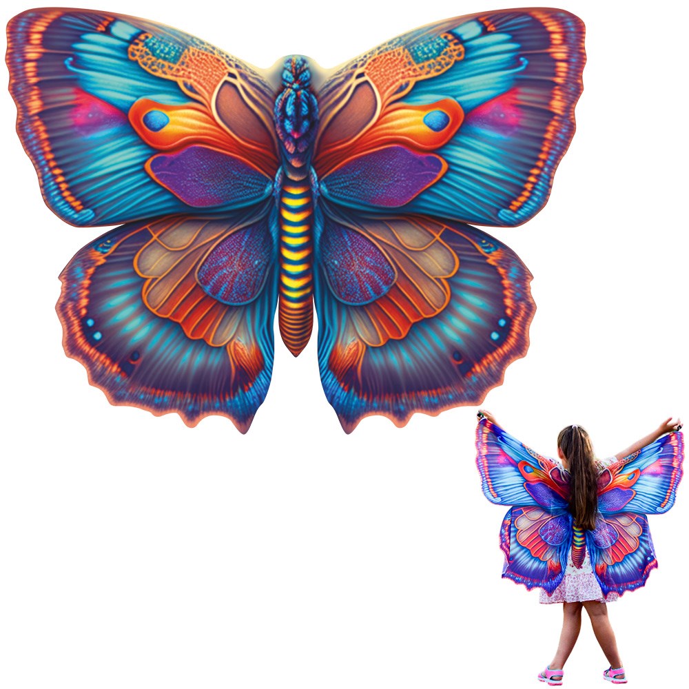 Костюм имеет яркий дизайн с принтом с изображением крылышек бабочки с разнообразными чешуйками. Ткань очень легкая и приятная на ощупь. При движении крылышки как будто трепыхаются, а ребенок начинает порхать.