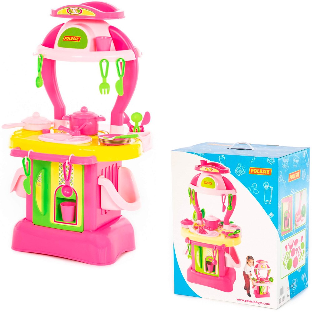 Кухня с выразительным дизайном понравится малышам. Она позволит оборудовать игровой домик и организовать его пространство по образу и подобию взрослого. Такие игры приучают девочек к ведению домашнего хозяйства, готовят ко взрослой жизни. Набор посуды с плитой еды привлекает внимание не только своим ярким внешним видом, но и функциональностью. С ним малышка почувствует себя настоящей хозяйкой и сможет приготовить куклам угощение. Кухня отличается современным дизайном. Есть плита, мойка, вытяжка, духовка, холодильник и полочки для посуды.
