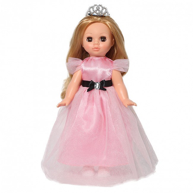 Эля праздничная 2 - настоящая принцесса. Она одета в шикарное платье из шёлка и органзы, украшенное контрастной лентой с бантом по линии талии, на голове сверкает диадема, на ногах туфельки. У Эли густые длинные волосы, прошитые, выполненные из качественного нейлона - их можно причесывать, завивать и укладывать, меняя образ модницы. Глаза игрушки - вставные закрывающиеся, звуковые устройства отсутствуют, ручки и голова выполнены из качественного винила, тело и ножки - пластмассовые. Благодаря подвижным ручкам и ножкам, Элю можно переодевать, садить и укладывать спать, что разнообразит игровые возможности и позволяет девочке развить фантазию и воображение.