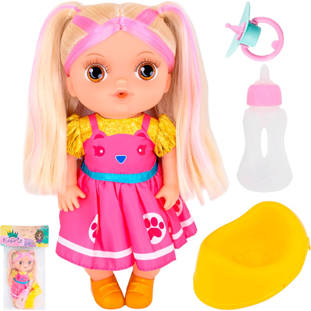 Комплектация: пупс (29,5 см) – 1 шт., соска-пустышка – 1 шт., бутылочка (12 х 5,5 х 4,5 см) – 1 шт., горшок – 1 шт.