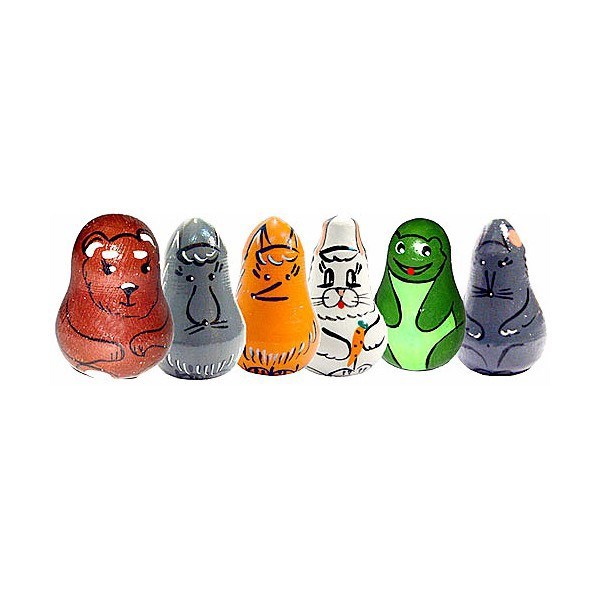Пальчиковый кукольный театр состоит из 6 деревянных фигурок ручной росписи - героев сказки "Теремок" - с отверстиями для детских пальчиков. Взрослому человеку эти наперстки подойдут только на мизинец. Зато детям они в самый раз – легкие, небольшого размера, они смогут использоваться в самых разнообразных играх. Самым маленьким деткам (1,5–2 годика) можно предложить научить сказочных героев здороваться: сгибать и разгибать пальчик, на который надета та или иная фигурка. Такая пальчиковая игра полезна не только для развития моторики, но и речи, фантазии и воображения. Другой вариант этой игры, когда фигурки надеваются на все пять пальчиков и персонажи начинают здороваться хором или поочередно с каждым, кланяясь друг другу.