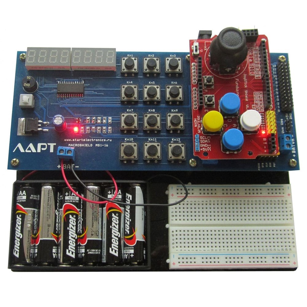 Макетное поле на 400 контактных точек для установки разли- ных датчиков, сборки несложных электронных схем.