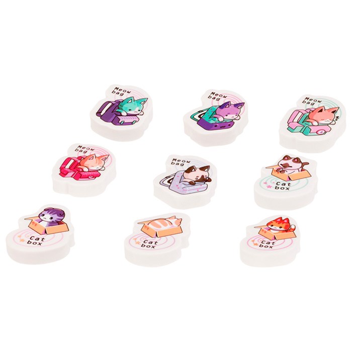 Ластики MESHU Meow-bag – забавные помощники в школе, офисе и дома. Ластики фигурной формы выполнены из высококачественной термопластичной резины. Ассорти из 9-и весёлых дизайнов ластика белого цвета с рисунком милых котиков. Отлично стирают чернографитный карандаш. Ластики представлены в дисплей-боксе.
