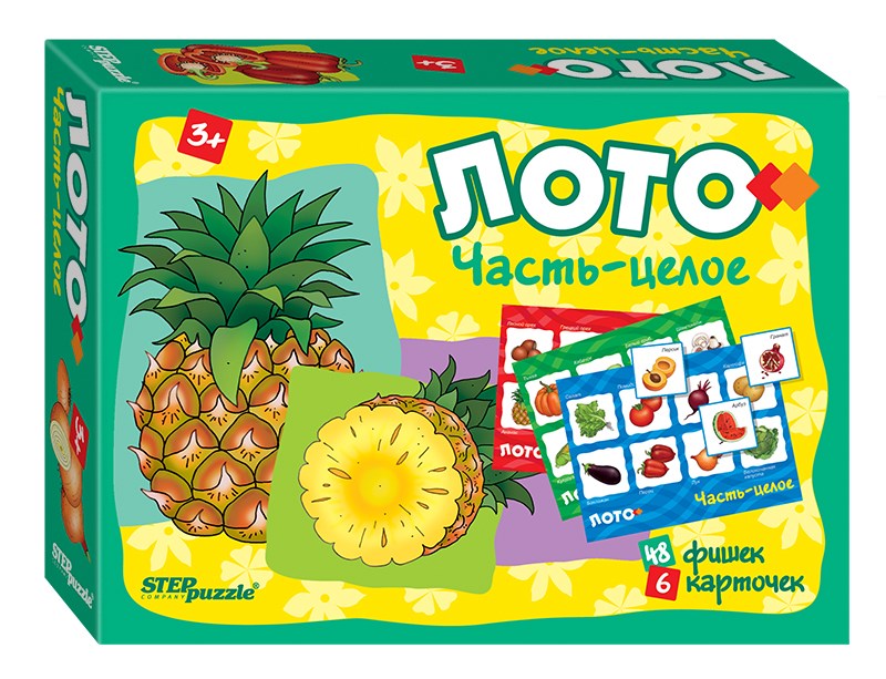 Лото “Часть-целое” знакомит с овощами, фруктами и ягодами. Учит находить целый предмет по его частям.