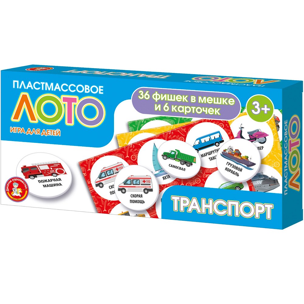 Изучайте вместе со своим малышом в игровой форме различные виды транспорта. В комплект игры входит: 6 картонных карточек, 36 пластмассовых фишек, мешочек для фишек, инструкция. Лото «Транспорт» развивает память, усидчивость, внимательность, аккуратность, расширяет кругозор и тренирует мелкую моторику рук.